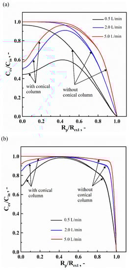 Effect of conical column on the exit concentration profile of the hollow tapered cylinder for the particle diameters of (a) 3 nm and (b) 10 nm at different flow rates.