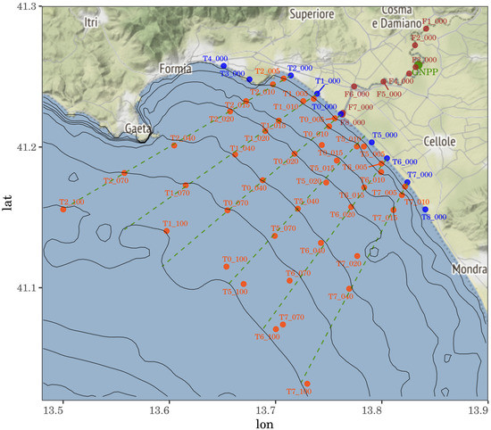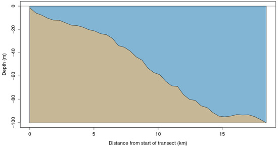 Figure 2 shows the bathymetric profile of a typical transect in the area under study (T0). After a slight descent in the first 5–6 km, there is a steeper slope. A similar behavior can be seen in the other transects.