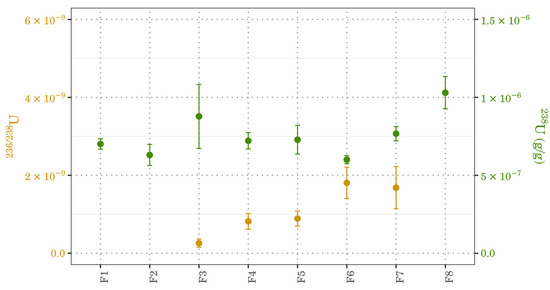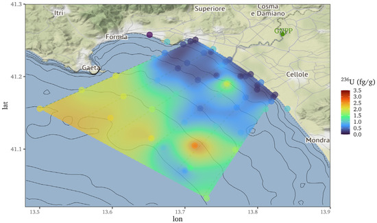 The concentration and isotopic ratio of uranium in coastal, shallow, and deep seawater are reported in Figure 9. Concentration values of 238U are greater than river ones and below 6.0 ng/g, with an average of 3.0 ng/g. The 236U/238U isotopic ratio values fluctuate around the value 2.0 × 10−9, corresponding to an average concentration of 236U of 6 ag/g.