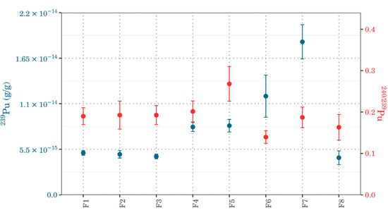 Figure 8 shows the concentration and isotopic ratio of plutonium for coastal, shallow, and deep seawaters. Concentrations of 239Pu were measurable and, in many samples, greater than river ones. In coastal water, they also fluctuate around 10.0 ag/g, while in deep water, their mean value is 5.0 ag/g. The 240Pu/239Pu isotopic ratio values also fluctuate around the 0.18 value.