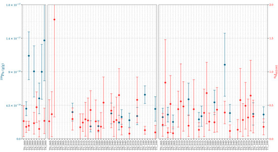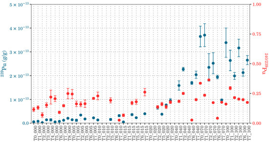 Concentration of 239Pu (in blue, on the left) and 239/240Pu isotopic ratio (in red, on the right) in marine sediments. The samples in abscissa are arranged by increasing depth of sampling. Values below the detection limit are not shown.