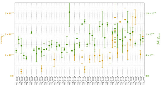 236/238U isotopic ratio (in orange, on the left) and 238U concentration (in green, on the right) in marine sediments. The samples in abscissa are arranged by increasing depth of sampling. Values below the detection limit are not shown.