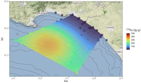 The same behavior can be seen in Pu. Indeed, a sharp increase in 239Pu concentration values, from 10 fg/g to 400 fg/g, is evident for sediment samples from the shoreline to 100 m depth (Figure 11), while 240Pu/239Pu isotopic ratio values are, as usual, about constant with an average value of 0.18. The spatial distribution of concentrations of 236U and 239Pu is shown in the maps in Figure 12 and Figure 13.