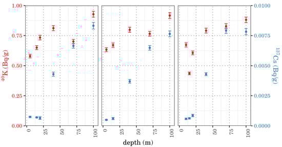 Gamma analysis on sediment samples was carried out to determine the activity concentration of 137Cs, a fission product both from the nuclear power industry and nuclear weapons, and of the widespread naturally occurring 40K isotope. The scope was to compare their specific activity with the abundance of actinides in the spirit of other studies shown in [28,29,30], and to find confirmation of the previously seen behavior of actinides in marine sediments.