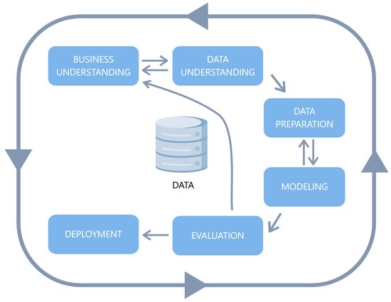 The DM process followed the CRISP-DM methodology, which is one of the most used for increasing the success of a DM project [14]. One of the main advantages of its utilisation is that it allows the construction and implementation of a DM model that can be used in a real environment, helping to support business decisions [15]. CRISP-DM is defined as a cyclic process, in which six phases are defined [16,17]: