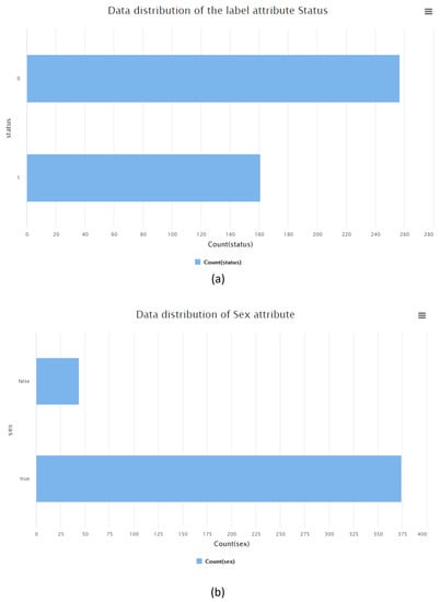 Lastly, it was also important to underline some interesting aspects of the given data. Therefore, Figure 3 presents the distribution of the label attribute—status—and the sex attribute, where it can be seen that the data are a little unbalanced in the label attribute and that there are much more women than men associated with this disease (which goes as expected in a real life scenario, as described in Section 1).