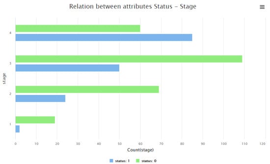 When comparing the label attribute and the stage attribute (Figure 4), it can also be concluded that, as expected, there are more deceased patients in the last stage of the disease—stage 4—followed by stage 3, which makes sense, given the fact that a patient is more likely to pass away when the disease is more advanced.