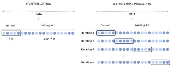 Following the selection of the models, it was necessary to define the different sampling methods for testing. Full training was not considered in this study; instead, three sampling methods were considered, namely, Cross Validation (CV), using 10 folds, and Split Validation (SV), with a split ratio of 0.7 and a split ratio of 0.8. CV uses all data for training, whereas SV uses a certain percentage for training and the remaining for testing, as can be seen in Figure 5.