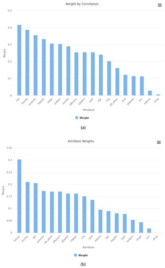 Such results are displayed in Figure 6, where the Weight by Correlation operator is shown in Figure 6a and the Weight by Information Gain Ratio operator is displayed in Figure 6b.