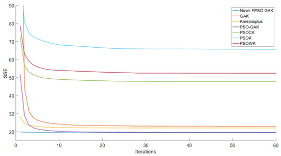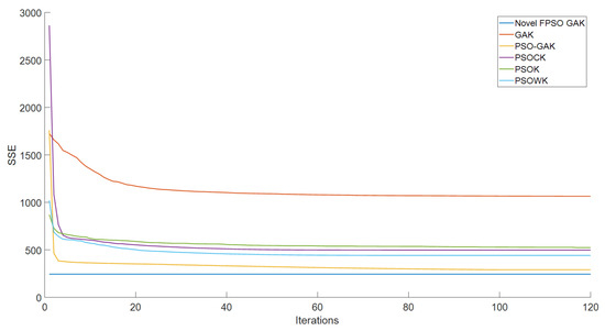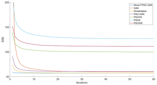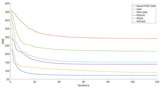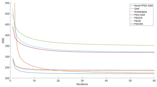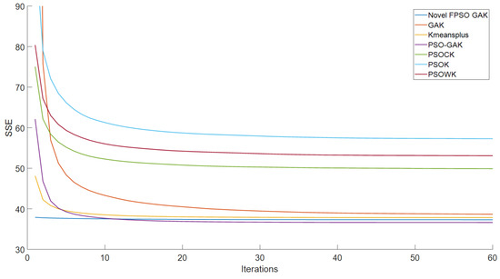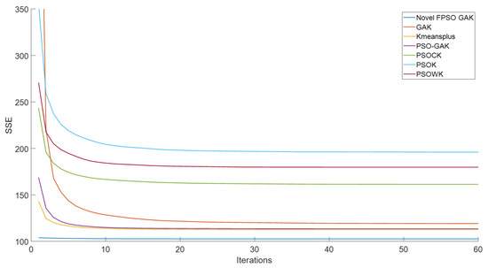 Figure 13 show that the proposed algorithm can obtain better particles than the GAK, PSOK, PSOCK, PSOWK, PSO-GAK and K-means++ as the input initial clustering centers of the K-means algorithm. With optimization by the proposed algorithm, improved clustering centers can be captured, significantly reducing the K-means algorithm’s sensitivity to initial clustering centers. When SSE is employed as the objective function of the k-means clustering algorithm, the clustering centers obtained by the proposed algorithm are used to perform the K-means clustering algorithm, which has faster convergence characteristics and a lower SSE value overall.
