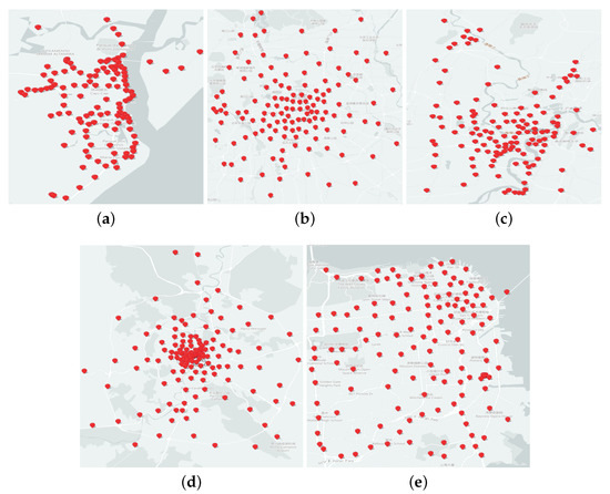 Figure 19 shows the centers of the clustering results for each algorithm in Baidu Map (put the clustering centers into the maps using the open software interface provided by Baidu Map). On the corresponding map, we intuitively perceive the distribution of clustering results based on various algorithms. According to pertinent maps, different clustering algorithms yield different clustering centers, indicating that different clustering results and identified urban hot areas are distinct. Since experiment GPS datasets are not cleaned according to road location limitations, the map may contain a very small number of outlier points.