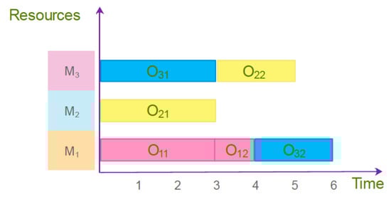 Table 1 provides an example of an FJSSP instance with three jobs, two operations per job, and three machines, where all machines can perform all operations. A possible solution to this problem is presented in the Gantt chart in Figure 1.