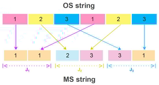 To decode the solution, is read from left to right. The jth occurrence of signifies that operation must be processed. This encoding allows that any permutation with repetitions represents a rightful sequence . For each part i of , the jth value represents the machine processing .