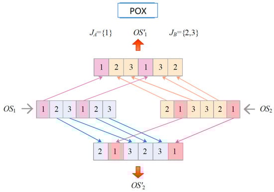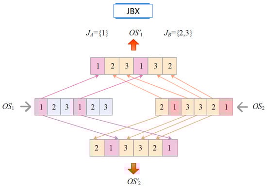 The second operator is the job-based crossover (JBX), which also defines the subsets and . From two sequences and , is obtained in the same way. The difference lies in the specification of , first taking the operations of in the same positions as . Next, the empty spaces of are filled with the operations of in seriatim. Figure 4 presents an example of a JBX crossover with three jobs and six operations.