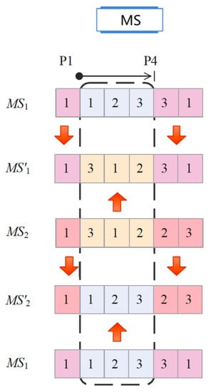 Smart-cells mutation uses two operators over the sequences, and each type of mutation is used with of probability. The first is swap mutation, where two positions of are selected and their elements swapped to obtain . An example is in Figure 6.