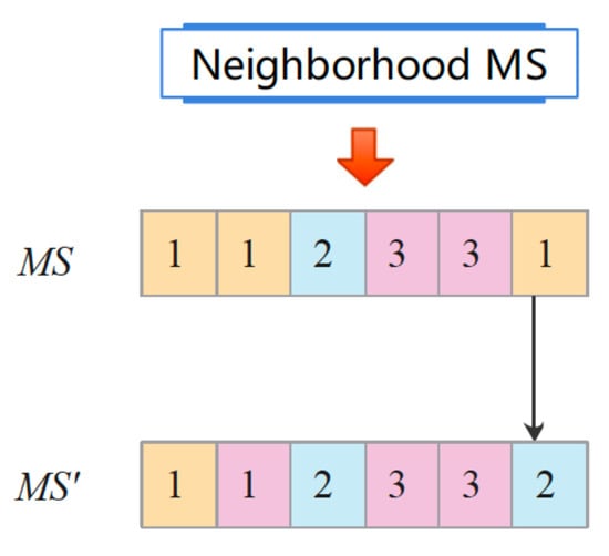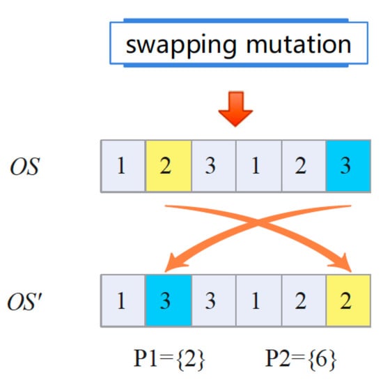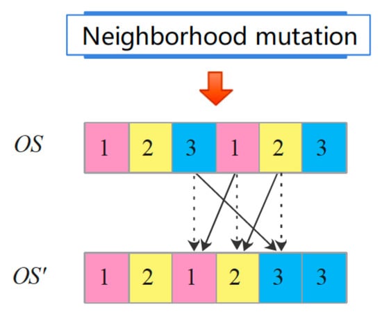 The second mutation is the random change of positions for operations of three different jobs. Three positions of belonging to different jobs are selected and their positions randomly swapped to obtain . Three operations from different jobs are chosen since exchanging their positions in would not generate a new solution if the operations were from the same job. Moreover, a more significant perturbation is achieved by selecting three operations. This is suitable for the exploration stage and to escape local minima, especially in cases with a more significant number of jobs and operations. This type of mutation was proposed by [19], obtaining good results. An example is depicted in Figure 7.
