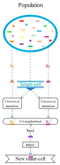 CA-type neighborhood used in the GA-RRHC. Colors represent the selection and modification of different smart-cells.