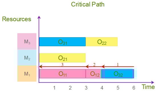A record of the previous task of each operation is kept when calculating the makespan to know which are the critical operations of a smart-cell, where the initial operations of each job do not have a previous operation. This record allows a fast computation of the critical operations by simply taking one of the last operations with a completion time identical to the makespan. Subsequently, previous operations on the same machine and at the same job are analyzed, taking that with end time equal to the start time of the present operation. A random pick is made if the same completion time is held by both previous operations. The procedure is repeated until an operation with no preceding operation is reached. Figure 10 presents the critical path of the solution represented in the Gantt diagram of Figure 1.