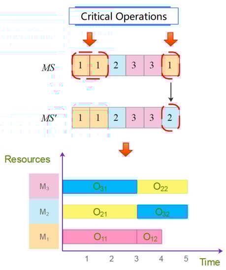 From the set of critical operations, one is taken at random, and a different feasible machine is chosen to have a new sequence . Additionally, another critical operation with probability is selected, and is swapped with any other operation in to have a new sequence and generate a different solution. Figure 11 shows a makespan improvement changing the machine assignment of a critical operation.