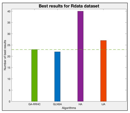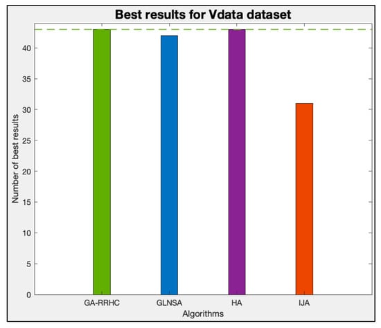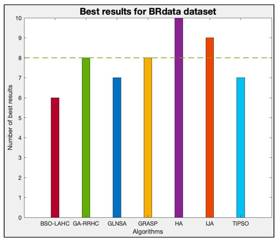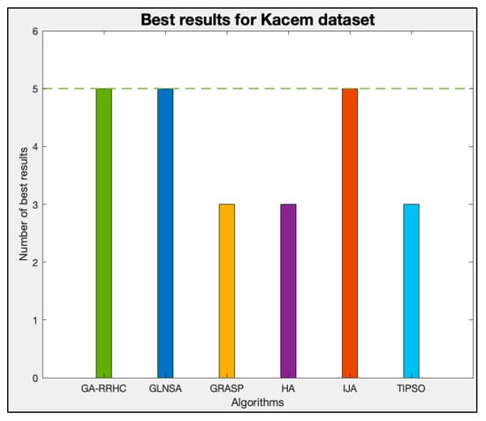 Six algorithms published between 2016 and 2021 were used to compare the GA-RRHC performance. These algorithms include the global–local neighborhood search algorithm (GLNSA) [40], the hybrid algorithm (HA) [19], the greedy randomized adaptive search procedure (GRASP) [51], the hybrid brain storm optimization and late acceptance hill-climbing (HBSO-LAHC) [38], the improved Jaya algorithm (IJA) [52], and the two-level PSO (TlPSO) [53].
