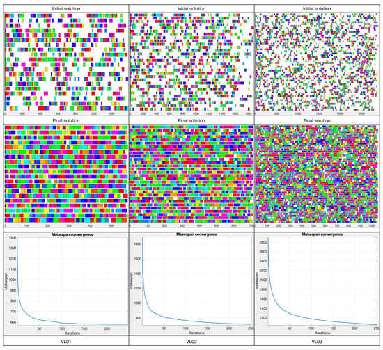 Table 11 shows that GA-RRHC performs much better than GLNSA, with enhanced performance for an increasing problem dimension. Figure 20 presents three examples, one for each VL instance, of the optimization process achieved by the GA-RRHC. In the Gantt charts, it is remarkable how the idle times decrease from initial random solutions and the continuous convergence to calculate the minimum makespan.