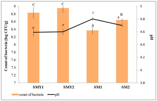 The bacterial strains used in the study significantly varied the sorbet group based on the cultivar “Miranda” of the Cucurbita moschata species, both in terms of pH value and count of LAB bacteria. In the sample SM2 (Figure 1) the highest count of LAB bacteria 8.95 CFU/g and the lowest pH value of 4.7 were noted.