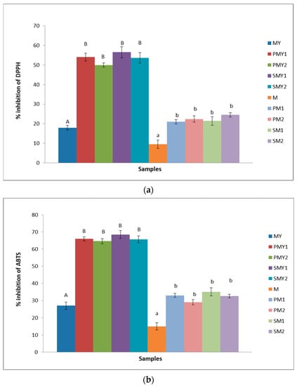 The previous studies [,] demonstrated that pumpkin cultivars can vary considerably in terms of antioxidant activity, which is the result of a large variation in the content of bioactive compounds. Results obtained in our study show that fermentation improved the ABTS and DPPH antioxidant capacity in probiotic frozen desserts (Figure 2).
