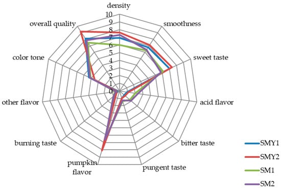 The assessed sensory characteristics of the products were previously selected and defined by a panel of trained panelists (experts). The following sensorial properties were ultimately assessed: density, smoothness, bitter taste, pungent taste, burning taste, pumpkin flavor, sweet flavor, acidic flavor, other flavor, tone of color, as well as overall quality.