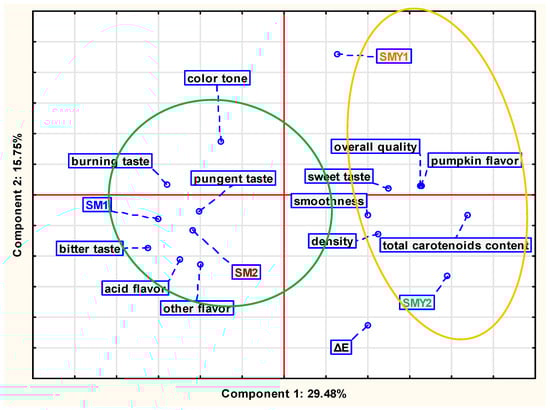 The principal component analysis (PCA) method is used, among other things, to reduce the number of variables describing the phenomena or to discover the validity between the variables []. The PCA method was used to interpret the sensory, color evaluation, and the total carotenoid content results of investigated pumpkin frozen desserts.
