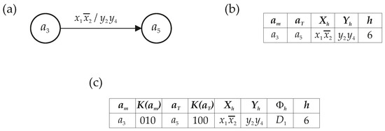 In (11), the symbol stands for a conjunction of the state variables corresponding to the code of a current state written in the h-th row of DST; the symbol stands for a conjunction of additional variables replacing the input signal written in the h-th row of DST (). If a pair determines the h-th transition of an FSM, then we propose to replace it by a pair of COs (as it follows from Figure 5). So, we propose to construct the SOPs of functions using product terms formed by conjunctions corresponding to codes of COs replacing a pair .