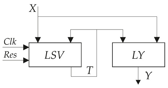 Under certain conditions, there is only one level of LUTs in the circuit of . To implement a single-level circuit, each function should depend on no more than I arguments. However, there are up to six address inputs in the present-day LUTs [19,33,34]. To balance the area-spatial-power characteristics of a LUT, it is necessary that the number of inputs does not exceed six [35]. Nevertheless, the total number of inputs and state variables of an FSM can significantly exceed the value of I. This leads to an imbalance between a very large number of FSM inputs, outputs and states, on the one hand, and a very small number of LUT inputs, on the other hand. To reduce the negative impact of this imbalance, it is necessary to improve the design methods of FPGA-based FSMs.