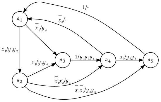 Nowadays, it is characteristic the fact that numerous digital systems are widely used in the daily life of human society [1,2]. Among other digital equipment, contemporary systems include a lot of various sequential devices [3]. The law of operation of a sequential device can be described by the model of the Mealy finite state machine (FSM) [4]. This model is used, for example, to set the behavior of (1) control devices [5,6]; (2) serial communication and display protocols [7]; (3) various software tools of embedded systems [8]; (4) control-dominated systems [9]; (5) different systems in robotics [10] and so on. This analysis led to the choice of the Mealy FSM model in our recent research.