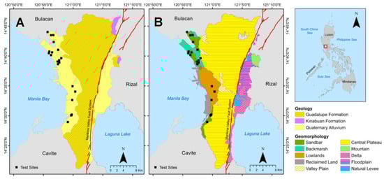 (A) Geological and (B) geomorphologic map of Metro Manila, Philippines, and the locations of the refraction microtremor surveys. Geologic map modified from BMG (1983) [38] and geomorphologic map obtained from MMIERS (2004) [39]. Locations of the testing sites are also depicted in black squares.