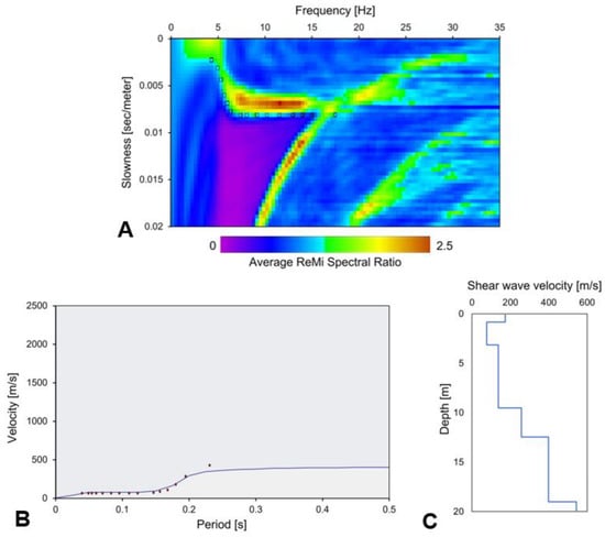 Data processing was done using ReMi Vspect and ReMi Disper modules. The Rayleigh waves were identified from other wave arrivals using slowness-frequency (p-f) transforms of the noise recording, using the ReMi Vspect module. The fundamental mode phase velocity was chosen along the minimum velocity envelope of energy within the p-f domain. Louie (2001) [47] demonstrated that selecting along this trend is the best procedure for choosing a dispersion curve to obtain the best estimate of the true phase velocities of shear waves (Figure 2A). The ReMi Disper module allows the modelling of a dispersion curve with multiple layers and shear wave velocities, to match the dispersion curve of the field data. The modeler varies the layer thickness and velocities until the resulting dispersion curve matches the previously selected dispersion points (Figure 2B,C).