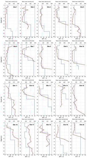 Variation of shear wave velocity (Vs) and penetration resistance (SPT-N) with depth for all twenty sites. Legend: blue lines for shear wave velocities; red lines for SPT-N values.