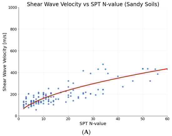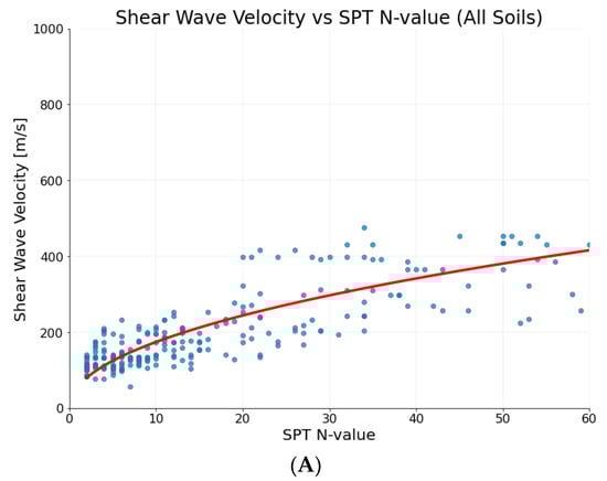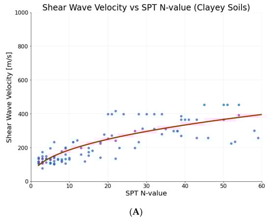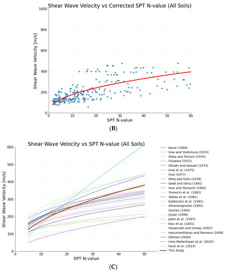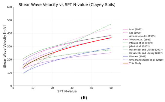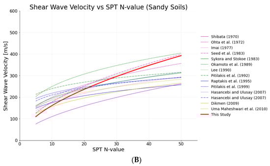 This relation has a regression coefficient R2 = 0.7515, which indicates a strong correlation between the datasets [68]. Empirical correlations for the soil types proposed by other researchers were also compiled and compared to the results of this study (Figure 4C). In this compilation, for correlations that follow the form Vs = a × Nb, the values of a range from 19 to 121 and b ranges from 0.24 to 0.85 can be observed. Among the compiled research that published empirical correlations, only Hasancebi and Ulusay (2007) [28] utilized corrected SPT-N values. On the other hand, Jinan (1987) [58] also proposed a correlation with a form Vs = a (N + b)c.