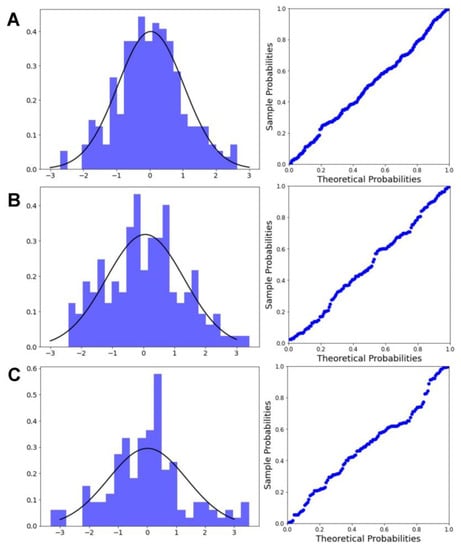 Histogram of the standardized residuals and the probability–probability (p-p) plots for (A) all soils, (B) sandy soils, and (C) clayey soils.
