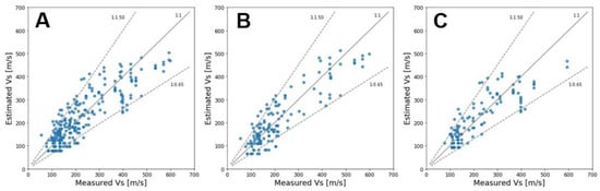 Measured versus estimated Vs for (A) all soils, (B) sandy soils, and (C) clayey soils with lines of 1:1.5, 1:1 and 1:0.65.