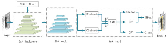 The overview architecture of the proposed ACA-Net is illustrated in Figure 2. ACA-Net mainly consists of three parts: (a) a backbone to extract features from the input image; (b) a neck to combine feature maps from different stages of the backbone; (c) a head to predict classification and bounding boxes (BBox) of defect. Specially, ResNet-50 [21] pretrained on ImageNet [43] dataset is used as the backbone. It is worth noting that the ResNet-50 is modified for detecting surface defects, which are the same as RetinaNet. ACM improved by MFAF is employed at stages conv3–conv5 of ResNet-50 to enhance the modeling capability. Secondly, FPN [34] is adopted as the neck on top of the backbone to integrate multi-level features. Finally, we adopt the head which is similar to RetinaNet [38]. The box subnet (BSubnet) and the classification subnet (CSubnet) is respectively utilized to yield regression features (RF) and classification features (CF). Note that the RF and are operated by AAM to yield more suitable anchors and make new features and . Afterwards, the and is used for regressing BBox and predicting classes of surface defects respectively.