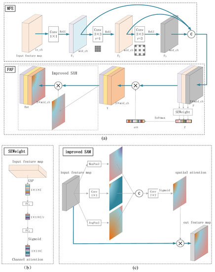The multi-scale feature adaptive fusion (MFAF). (a) The Architecture of MFAF. (b) SEWeight, (c) The improved SAM.