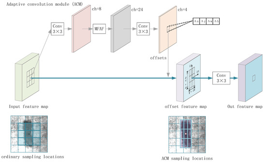 (2) An adaptive convolution module (ACM) is proposed in this work, which can adjust the location and shape of the convolution unit according to surface defects with different shapes and locations.