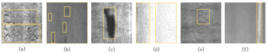 Defect images in NEU-DET. The yellow box is a groundtruth of a defect. (a) Crazing. (b) Inclusion. (c) Patches. (d) Pitted surface. (e) Rolled-in scale. (f) Scratches.