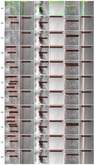 Comparison of detection results on NEU-DET. (a) Groundtruth, (b) YOLOv3, (c) YOLOF, (d) YOLOX-l, (e) SSD, (f) GA-RetinaNet, (g) ACA-Net (ours), (h) TridentNet, (i) Faster R-CNN, (j) GA-Faster R-CNN, (k) ACA-Faster R-CNN (ours).