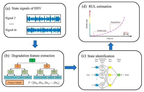 As shown in Figure 1, the degradation prognostic strategy includes signal acquisition, degradation feature extraction, degradation state estimation, and RUL prediction. Figure 1a shows the state signals collected through the whole life cycle of the valve. Figure 1b uses the signal processing method to extract the characteristics of the collected state signals. Figure 1c uses the FNN method to predict the degradation state. Figure 1d predicts the degradation trend and RUL of the valve.