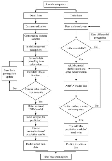 The HSV health index curve contains both linear and nonlinear elements. Therefore, the use of a single model is inadequate for prediction. The present study constructed a hybrid model. Firstly, raw data were filtered using the ARIMA model with the nonlinear law included in the model residuals. The residuals were then input into the LSTM model to extract the nonlinear law. Finally, the predictions based on the ARIMA–LSTM model were superimposed to obtain the final prediction results. Figure 3 shows the workflow of the hybrid models.