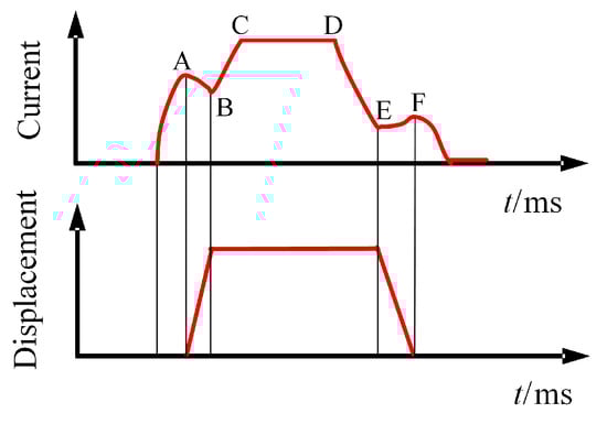 Figure 5 shows the schematic diagram of the HSV current change and spool displacement curve. The working process of the HSV consists of four stages: (1) the actuation process; (2) the movement process; (3) the holding process; and (4) the release process.