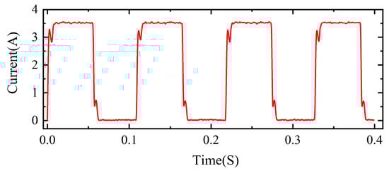 The data collection system contained a water hydraulic piston pump driven by an electric motor, which was used to provide a constant flow rate to the system, as well as a pressure relief valve, which regulated system pressure. The working pressure is set to 10 MPa and the switching frequency of the valve is 10 Hz. When the HSV fails, the valve spool is slightly worn, and the actuator temperature is very high and fails. Therefore, the main reason for the failure of this HSV is the damage to the actuator. Figure 7 is a partial current signal collected from the test. The figure suggests that the current waveform is not a complete rise and fall process, which is consistent with Figure 5. It shows the rationality of the signal acquisition process and results. At the same time, the performance degradation index of the HSV can also be defined according to the change of the current waveform.