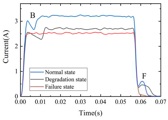 Figure 9 is the current signal diagram under three states. The figure suggests that with the performance degradation of the HSV, point B and point F gradually smooth and finally disappear. Figure 5 shows that point B and point F represent the opening response time and closing response time of the HSV, respectively, indicating that with the degradation of HSV performance, the switching response time gradually increases. When the HSV fails, there are no points B and F on the current curve, and the valve spool no longer acts. Moreover, with the performance degradation of the valve, the driving current gradually decreases, indicating that the resistance of the actuator gradually increases.