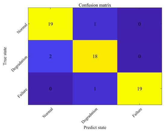 The number of neurons in the input layer of the FNN was equal to the number of eigenvalues in the training sample. Since there were eight eigenvalues for each feature vector, there were an equivalent number of neurons in the input layer. The number of input layer nodes, output layer nodes, and membership functions are 8, 1, and 18, respectively. The corresponding m and n in Figure 1c are 18 and 8, respectively. The training times, expected error, and learning rate η of the neural network were 6000, 0.1, and 0.001, respectively. Figure 10 shows the confusion matrix generated through enumeration of the output results of test sample data. From the figure, the number of correct classifications is displayed on the diagonal of the matrix. The FNN prediction accuracy of the state of the HSV was (19 + 18 + 19)/(19 + 1 + 2 + 18 + 1 + 19) = 93.3%. Therefore, the FNN could meet the requirements of degradation state detection.