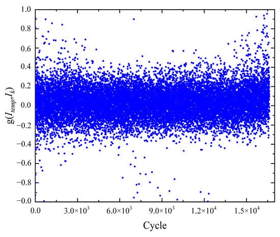 - Data normalization processing: The performance degradation index g data were normalized so that the input value of the ARIMA–LSTM ranged between [0, 1]. This was done to allow faster and more stable convergence of the ARIMA–LSTM model. The normalization formula used was:where X is the original data, Xnorm is the normalized data, and Xmax and Xmin are the maximum and minimum value in the original data, respectively.